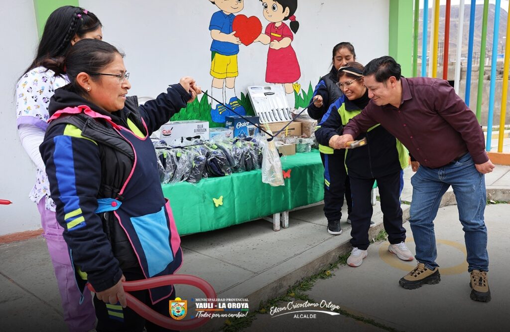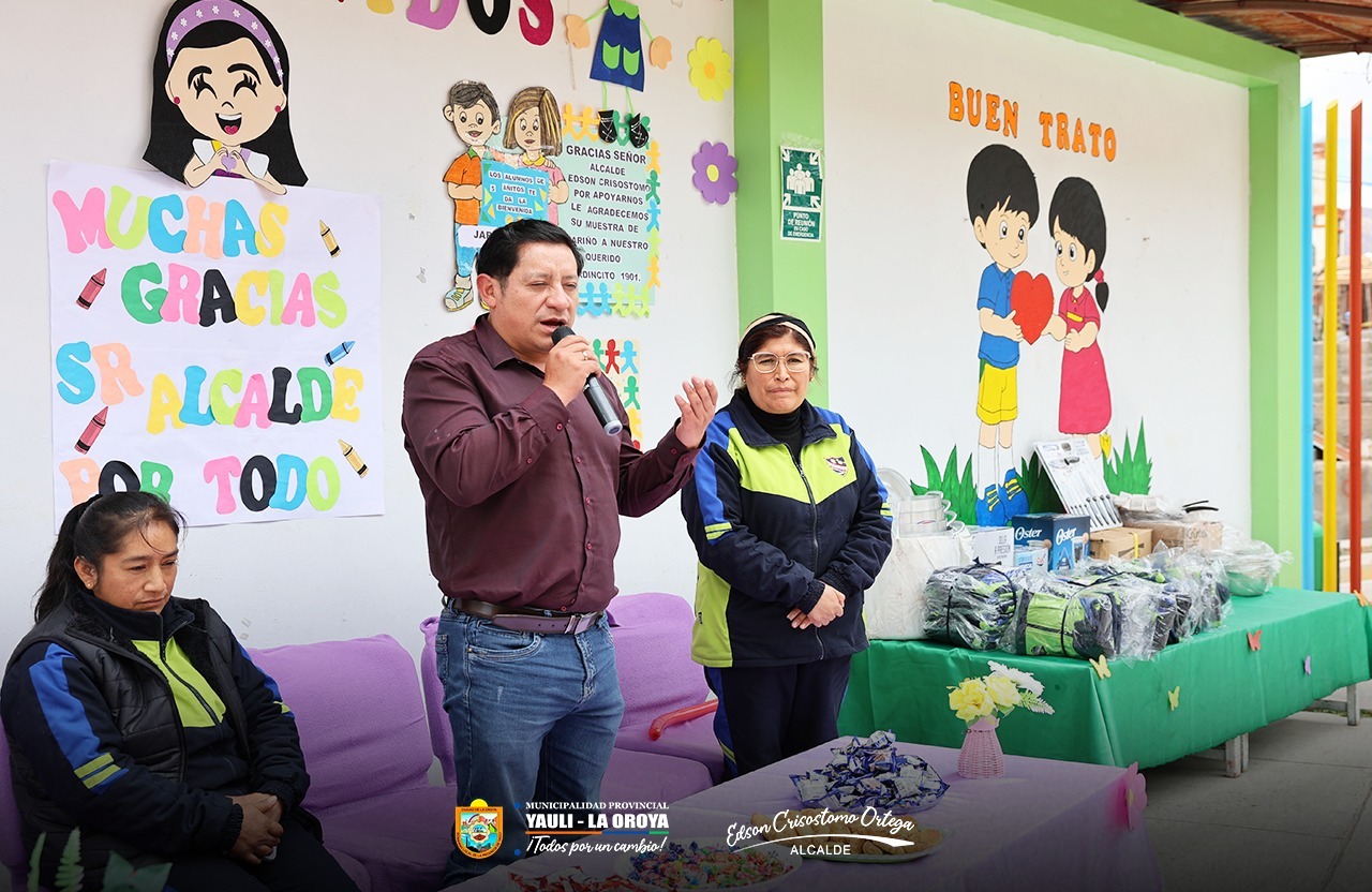 (Miercoles 10 de setiembre 2025) En el marco del compromiso con la mejora de las condiciones educativas en la provincia, el alcalde de la Municipalidad Provincial de Yauli – La Oroya, Dr. Edson Crisóstomo Ortega, realizó la entrega de buzos deportivos y menaje escolar a la Institución Educativa Inicial N.º 1901, ubicada en el distrito de Yauli.