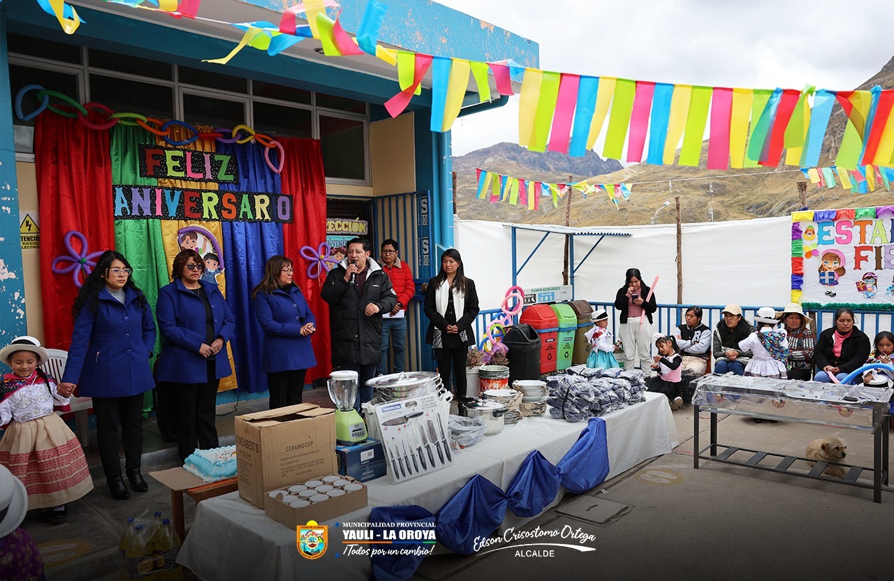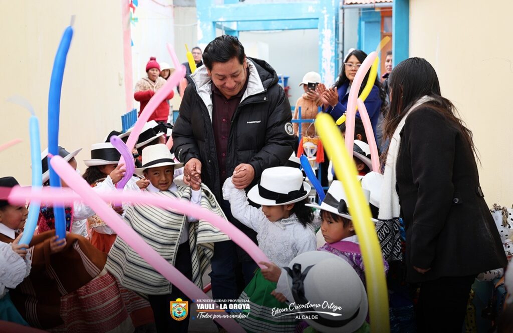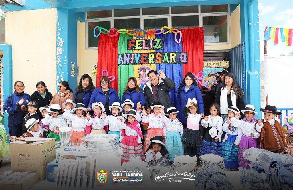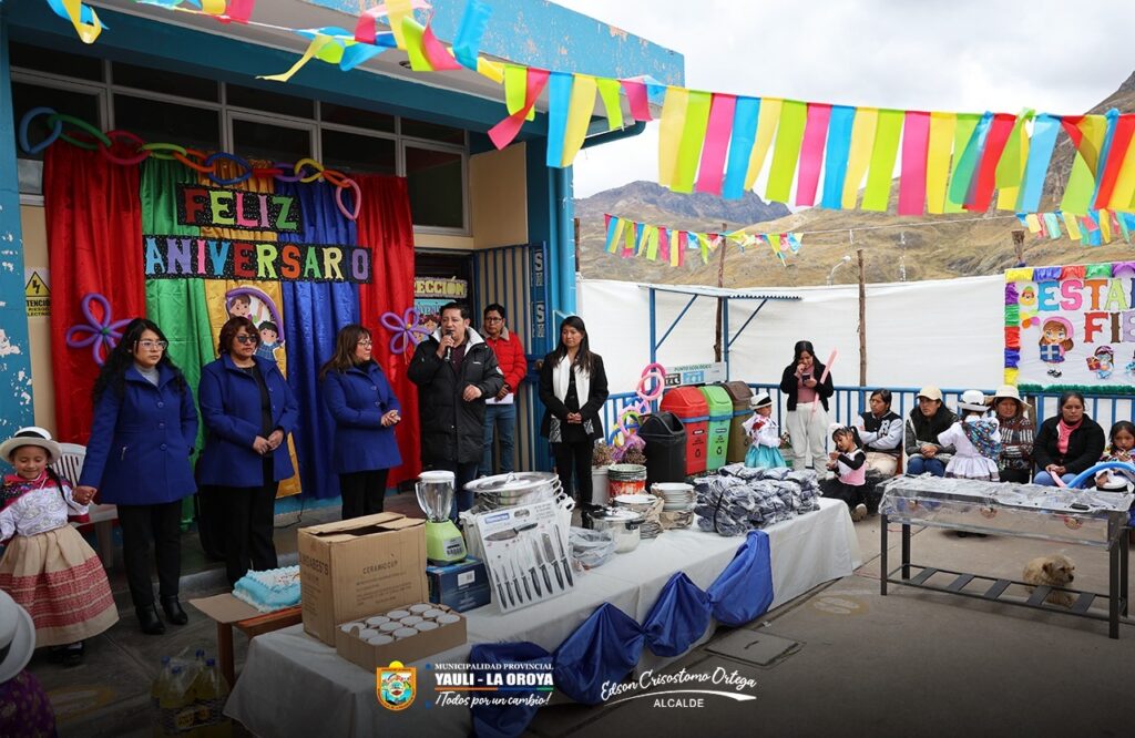 (Lunes 15 de setiembre 2025) Como parte de las acciones de apoyo a la primera infancia y con el firme compromiso de seguir fortaleciendo la infraestructura educativa en la provincia, el alcalde de la Municipalidad Provincial de Yauli – La Oroya, Dr. Edson Crisóstomo Ortega, realizó la entrega de buzos deportivos y menaje escolar a la Institución Educativa Inicial N.° 334, ubicada en el distrito de Yauli.
