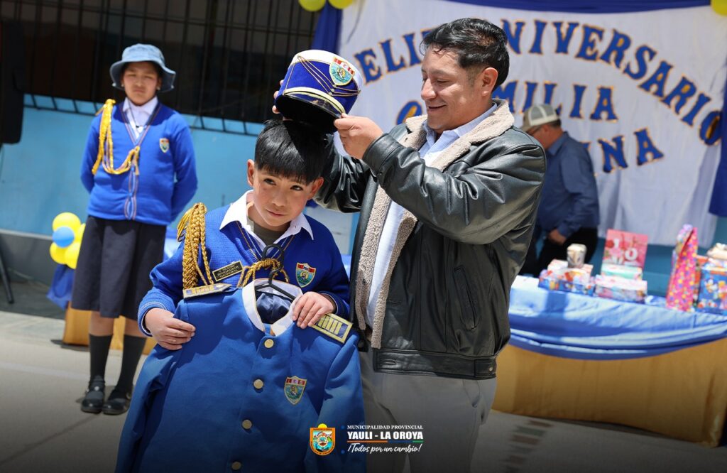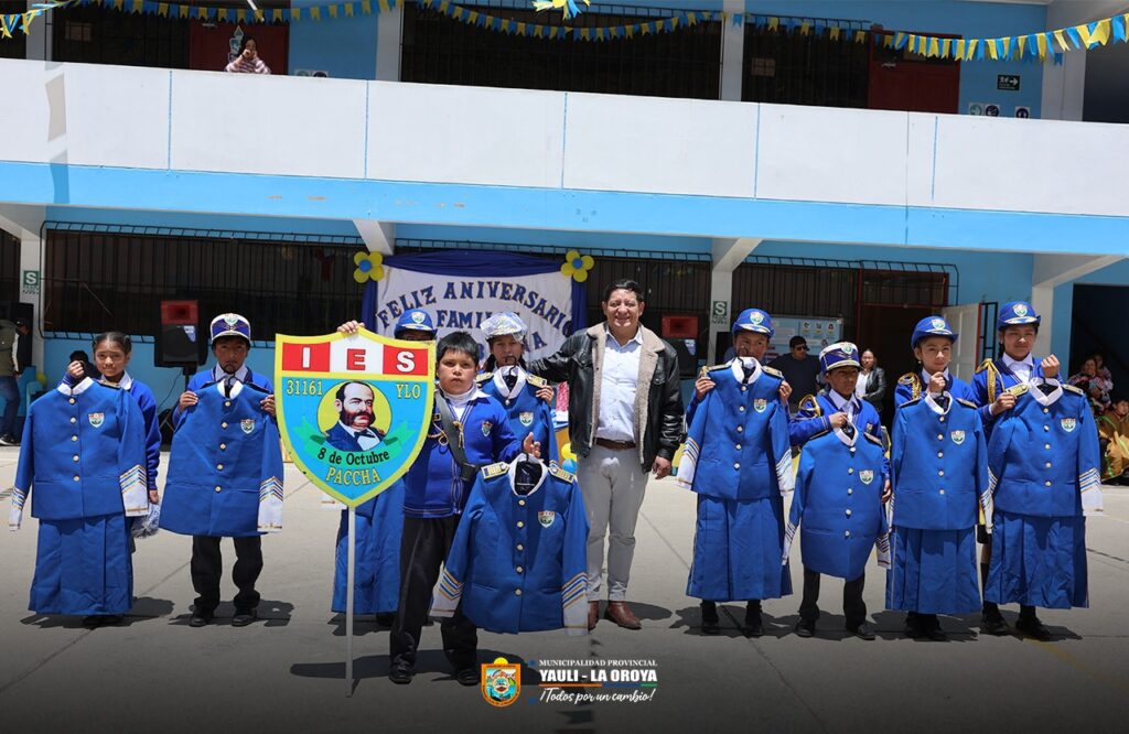 (Jueves 09 de octubre 2025) En el marco de las celebraciones por el aniversario institucional de la I.E. “8 de Octubre” del distrito de Paccha, la Municipalidad Provincial de Yauli – La Oroya, encabezada por el alcalde Edson Crisóstomo Ortega, realizó la entrega oficial de uniformes de gala destinados al Estado Mayor del colegio.